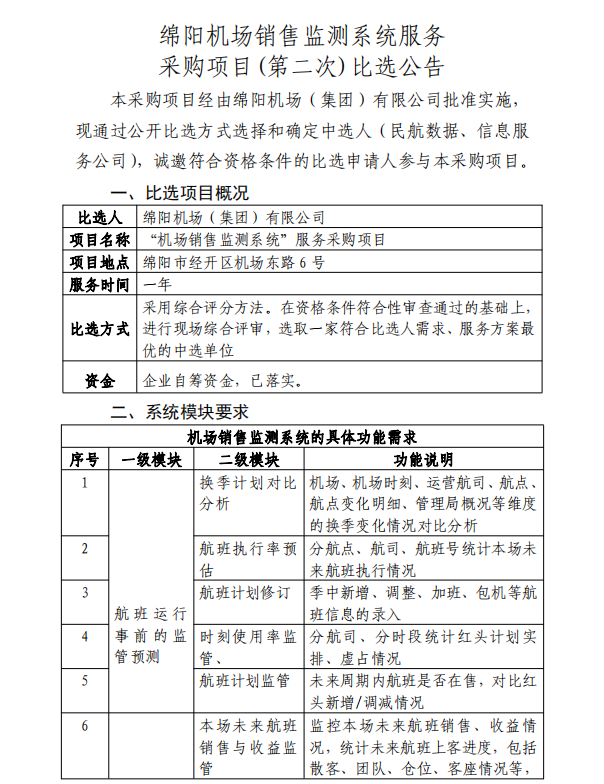 綿陽機(jī)場銷售監(jiān)測系統(tǒng)服務(wù)采購項(xiàng)目(第二次)比選公告