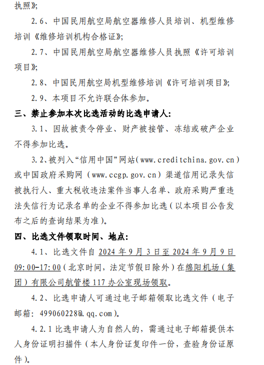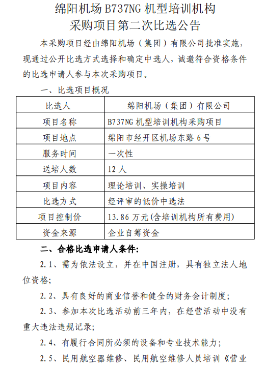 綿陽機(jī)場(chǎng)B737NG機(jī)型培訓(xùn)機(jī)構(gòu)采購項(xiàng)目第二次比選公告