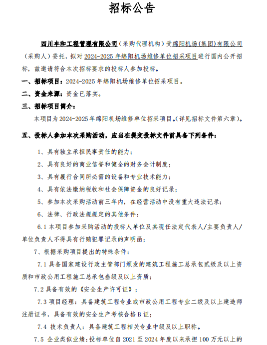 2024-2025年綿陽機(jī)場(chǎng)維修單位招采項(xiàng)目招標(biāo)公告